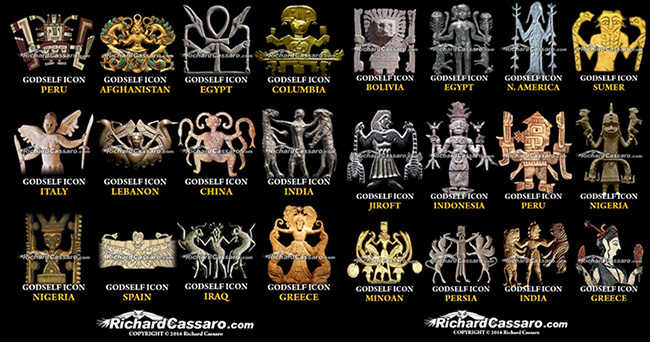 Independent researcher Richard Cassaro treats this archetype much like my white whale the bullroarer: evidence of a shared cultural root across the globe. He even calls it the “Godself Icon”, echoing my contention that the Snake Cult could make one “as the gods.”