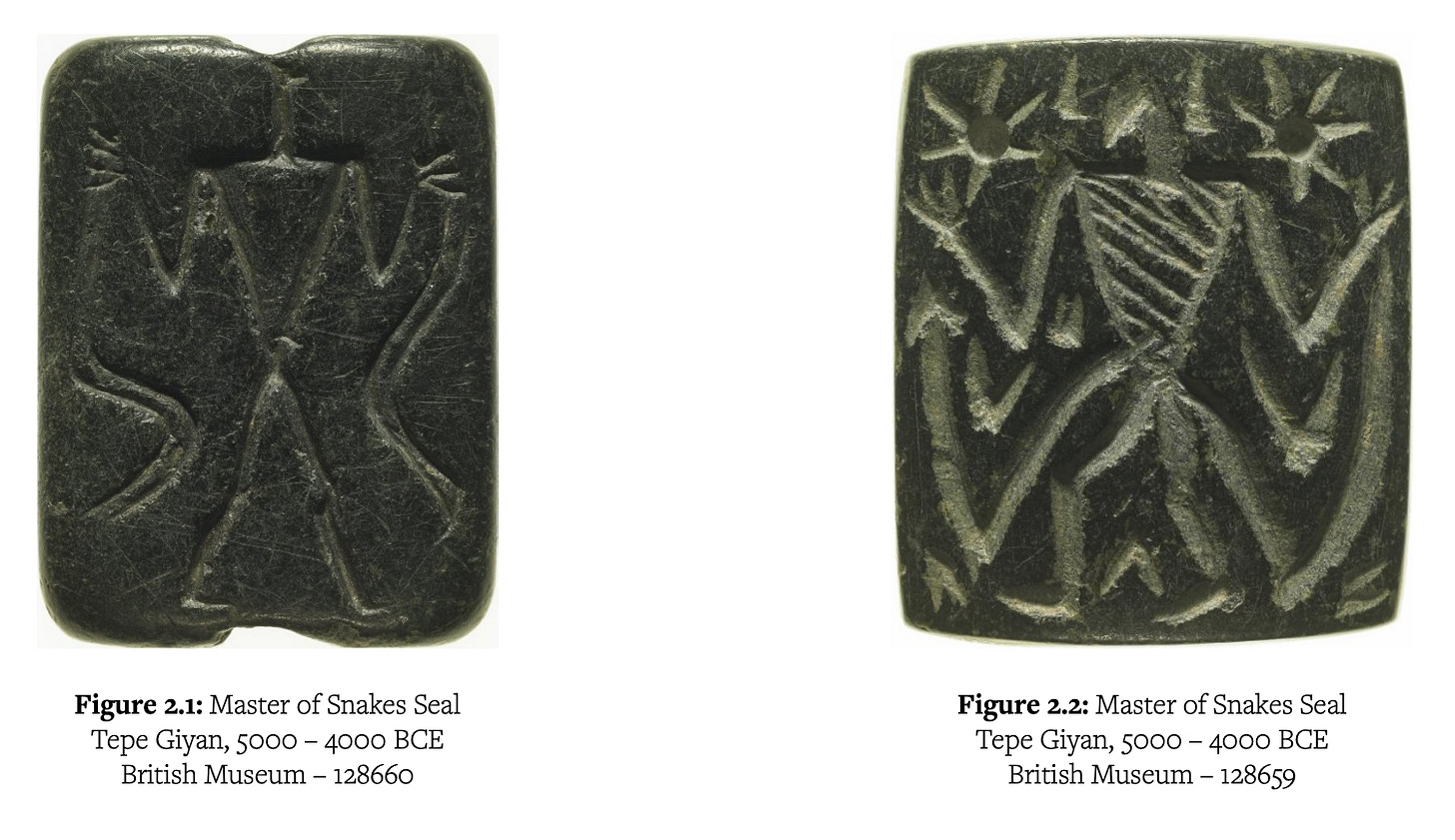 I intended to leave the post as a simple observation, logging these as possible echoes of the Snake Cult of Consciousness. But the myths intersect with EToC in ways that go beyond the obvious repetition of women using venom for male fortification. Scholars link this very tri-snake motif to the Mistress of Animals, a well-documented archetype running through the heart of the Snake Cult2.